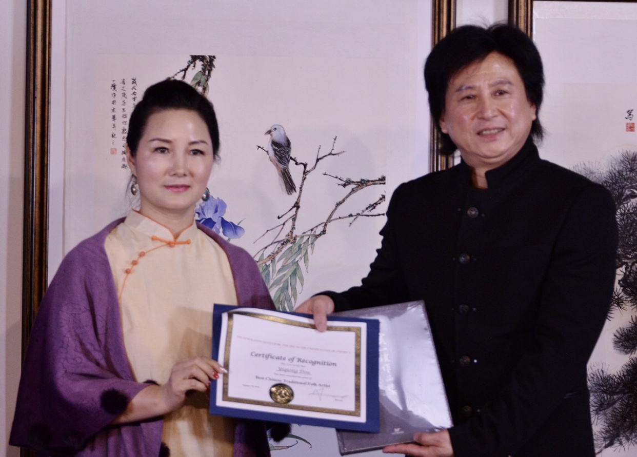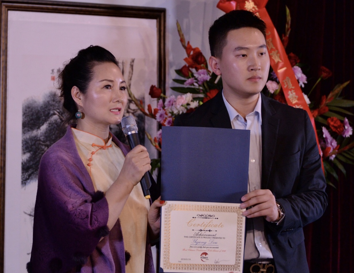 世界名人俱乐部负责人闫俊安向窦一琼颁发杰出艺术家证书