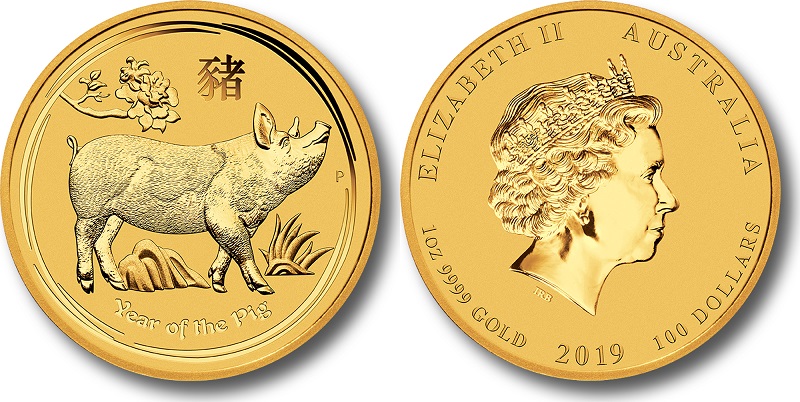 买金过年,取个好意头。「足金」好运,祝愿家人、爱人健康,平安。澳洲生肖金币系列是由澳洲Perth Mint铸币厂所铸造。 每一年皆限量发行,是投资兼收藏的最佳选择。以纯度为99.99%的纯金精铸而成, 正面为小猪的侧面图案站在岩石和草地上,样子可爱活泼,左上方更有牡丹花。上方更刻有中国汉字“猪”,象征中国猪年,旁边的’P’字代表柏斯铸币厂,下方刻有“Year of the Pig”,整个币面呈现出一片祥和,极具中华民族传统文化的气息。硬币的反面为英女皇伊丽莎白二世肖像,年份2019。这枚猪年金币,不管是年节送礼,弥月礼物还是自我珍藏,都是迎接2019猪年最好的选择!