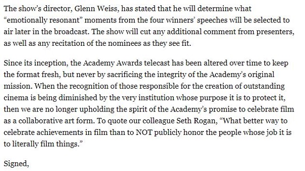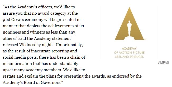 据奥斯卡组委会此前表示,以上几个奖项将在广告时段颁发,获奖者的演讲将被剪辑而后播出。美国摄影师协会在其官网致信奥斯卡组委会主席John Bailey,希望组委会可以慎重考虑以上决定。