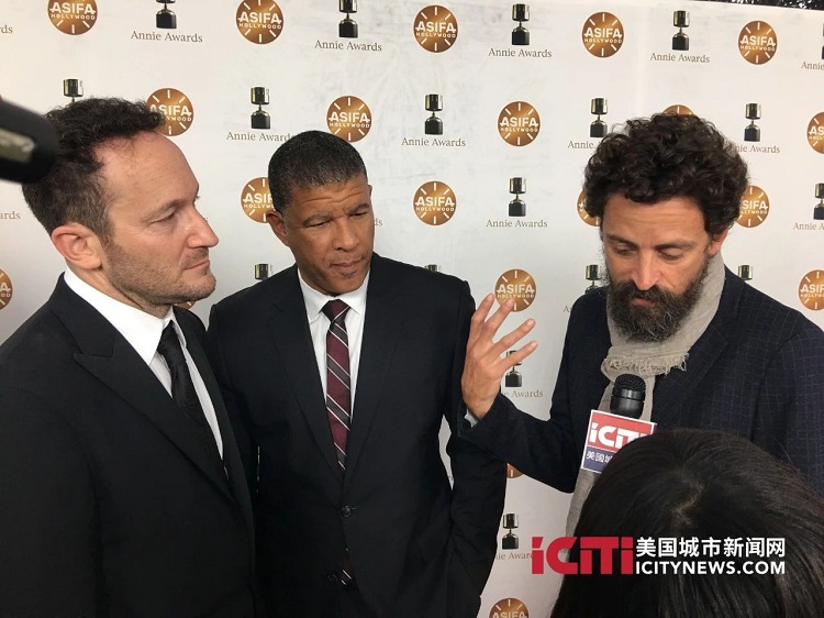 第46届安妮奖最佳电影动画导演获奖者Peter Ramsey(左一)、Rodney Rothman(左二)、Bob Persichetti(左三),获奖作品《蜘蛛侠:平行宇宙》