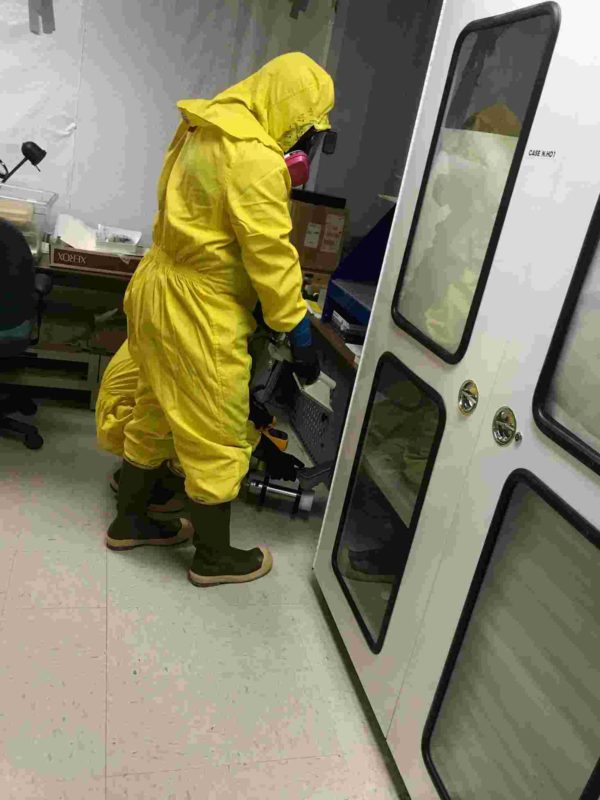 国家公园在2018年6月18日把这些装有铀矿石的水桶从博物馆大楼移走了。看上去风险好像已经在2018年解除了,但斯蒂芬森告诉CNN,公园管理局的工作人员处理放射性物质时十分不专业,他们只是戴着从杂货店买来的园艺手套来搬水桶,并用拖把的把手将水桶抬到皮卡车送走。并且他们在处理了铀矿石后,又把这3个水桶重新拿回到公园。