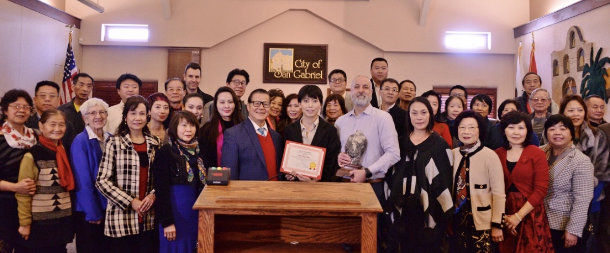 城市新闻2月19日圣盖博市报导,来自上海的石雕艺术家杨菁菁向圣盖博市政府捐赠一尊印第安头像,圣盖博市市议员廖钦和、市政经理Mark Lazzaretto、圣盖博图书馆馆长Julie Sorensen、美国阳光学院院长冰人、美国大西北总商会执行会长阎笑雷、中华工商妇女企业管理协会加州分会理事长李余妙龄、中华艺术宫馆长鲁安、美国北京联合会会长魏林峰、美国中华少数民族文化中心 执行主席蒋丽莎等40多人出席捐赠仪式。