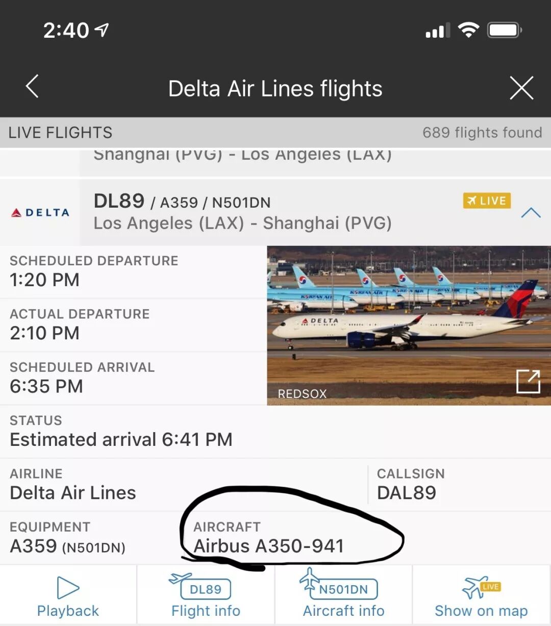 我们找到从洛杉矶飞往上海的DELTA89,查看信息,会发现该航班使用的是空客的飞机。当然,除了机型以外,该航班的出发时间、落地时间、飞行航线等十分实用的信息,也都可以一并查到。