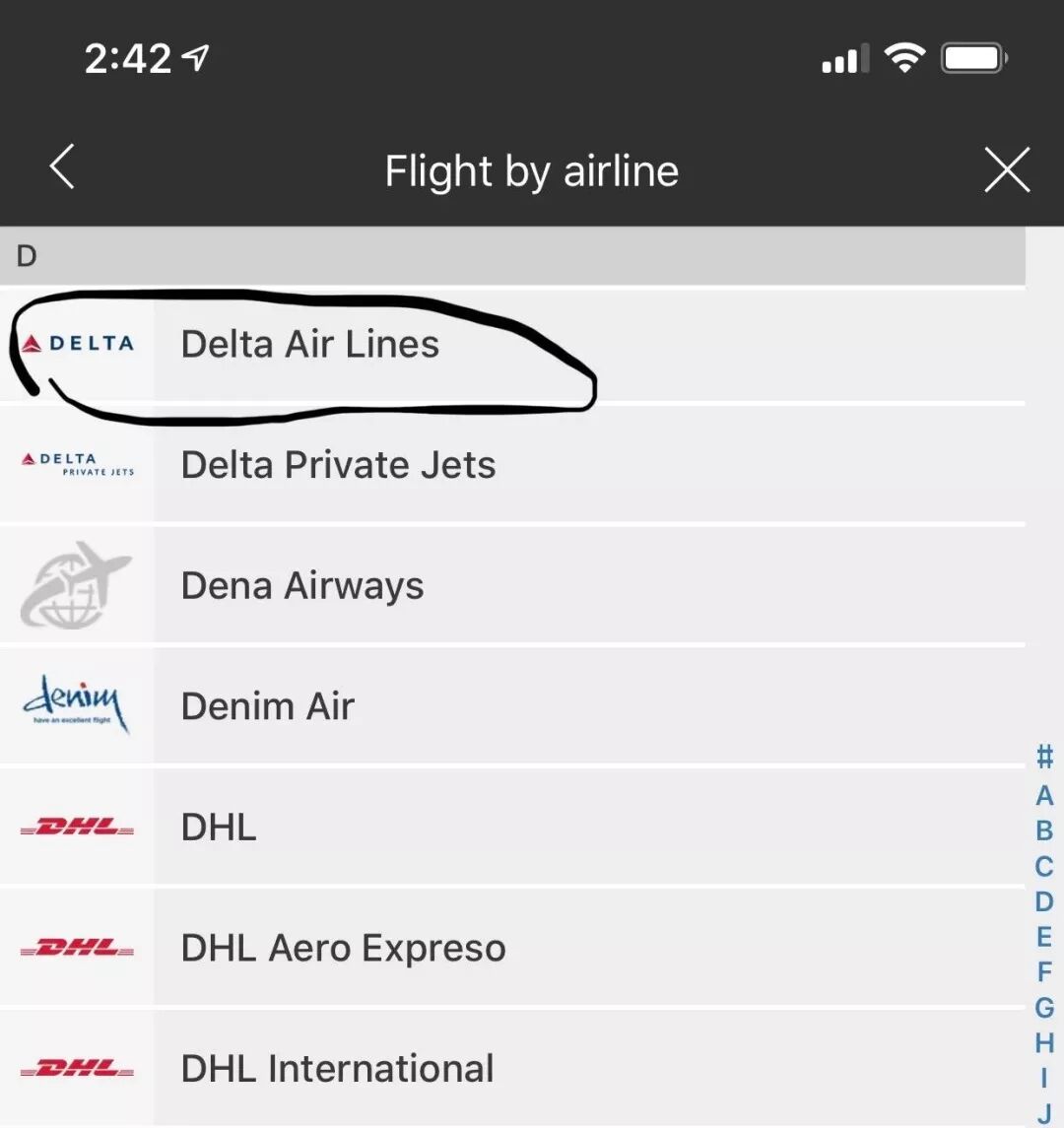 然后就会出现各大航空公司的英文名称页面,我们找到DETLA航空