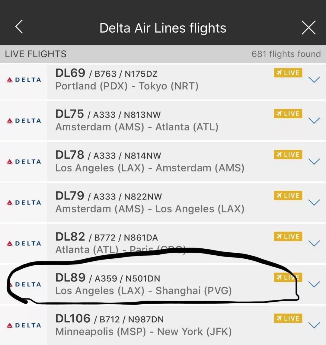 小编接下来以在手机APP版的flightradar24中,搜索从洛杉矶飞往上海的DELTA 89航班的机型为例,为大家演示如何搜索航班型号信息: