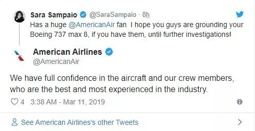 在对一位乘客质疑该机型的安全性时,AA回答道:“我们对这架机型、对我们的乘务人员都有信心。他们是业内最有经验的”。
