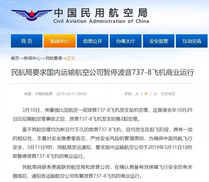 中国民航局表示,“两起空难均为新交付不久的波音737-8飞机,且均发生在起飞阶段,具有一定的相似性,本着对安全隐患零容忍、严控安全风险的管理原则,为确保中国民航飞行安全,3月11日9时,民航局发出通知,要求国内运输航空公司于2019年3月11日18时前暂停波音737-8飞机的商业运行。”