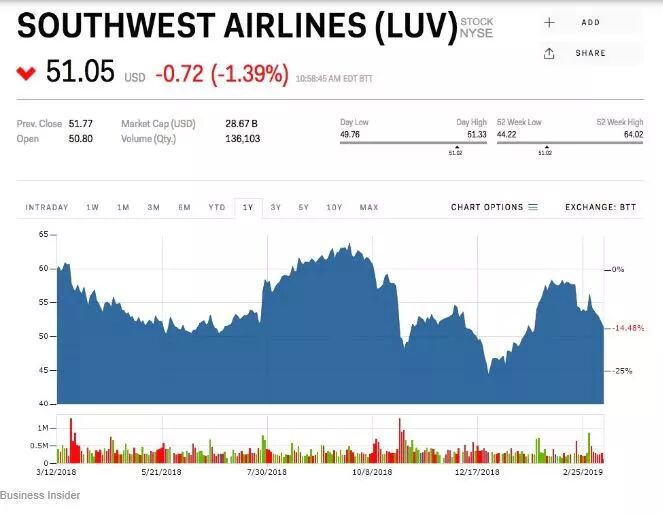 西南航空是美国境内拥有该机型最多的航空公司。受到坠机事件的影响,西南航空的股票今日大幅度下跌。