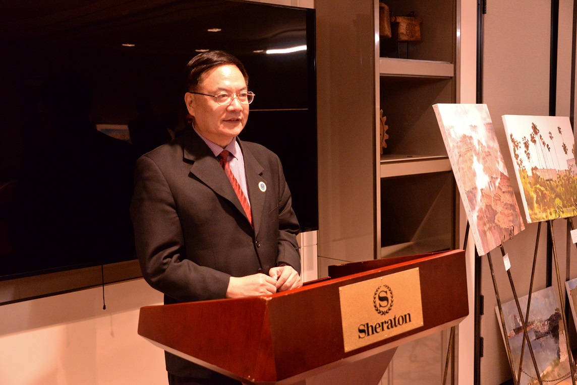 知名旅美油画家左夫主持中国画家赴美写生油画作品展开幕仪式,美国华人总商会会长程远、会长特别助理李胜、副会长于忠霞、总商会秘书长、中华艺术宫馆长鲁安、侨界代表蒋丽莎、曾文剑、陈杰、蒋有瑝、樊秀慧,书画界代表周平珖,孙晓华等近百人参加。程远会长对来自中国的油画家来美写生之旅表示热烈欢迎,并特别感谢会长助理李胜卓有成效的组织活动。代表团团长王征骅表示,虽然多㳄来美,但旅游写生是一个梦想,今次在美国华人总商会和李胜赞助支持下,终于实现多年梦想。