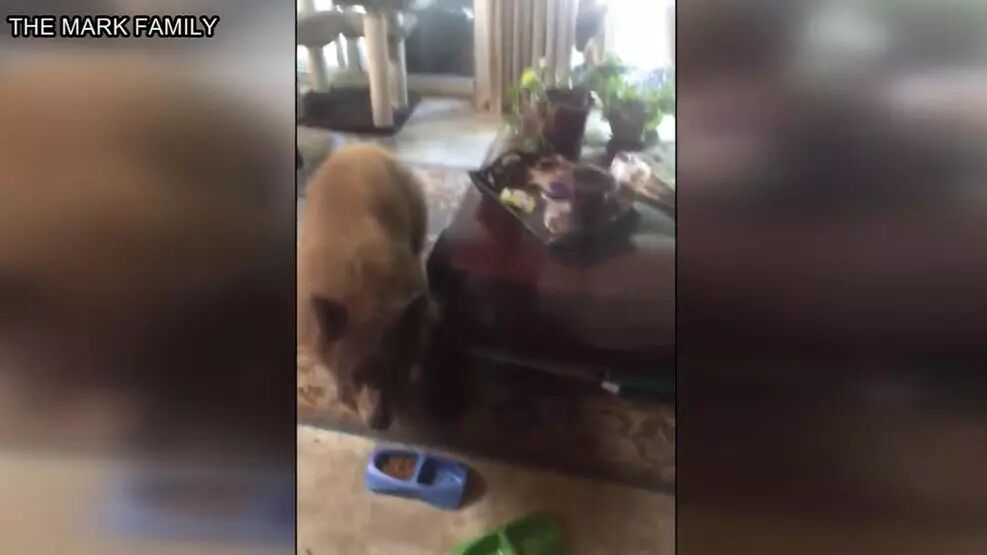 饥不择食闯入客厅开始偷吃猫食的大熊。
