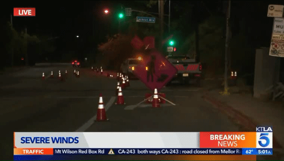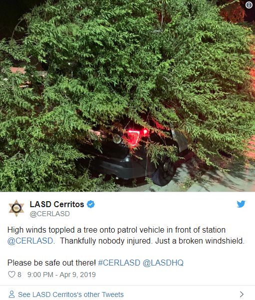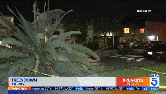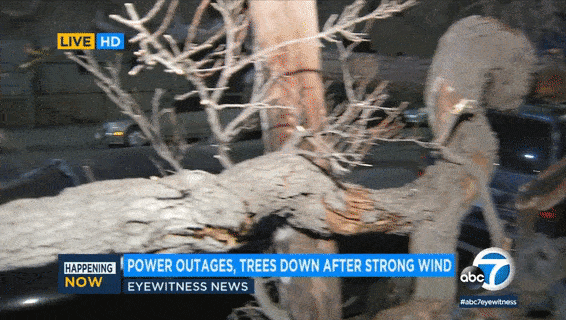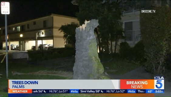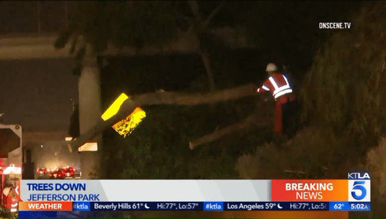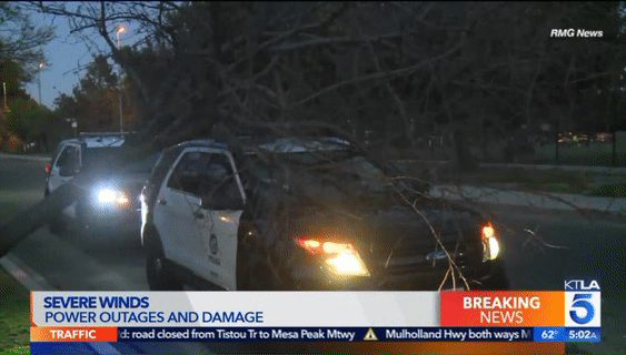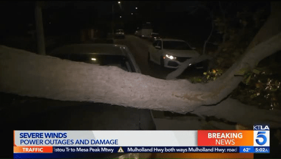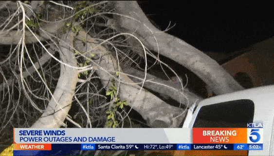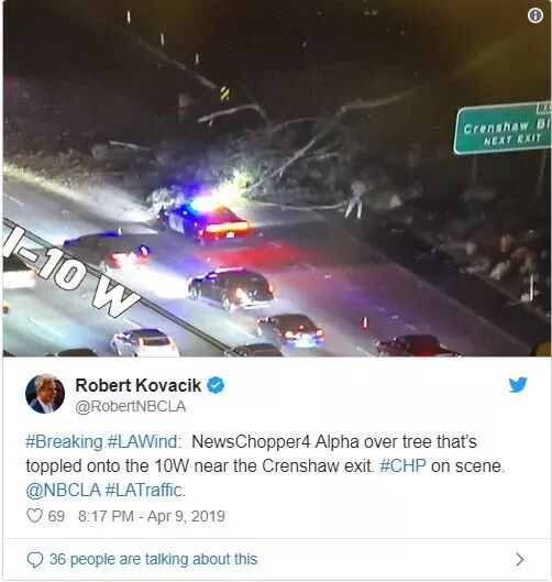 在10号高速的 Crenshaw Boulevard.附近,一辆大树被风卷倒后横在道路中间,截断了至少2条车道,导致10号公路向西的交通瘫痪。