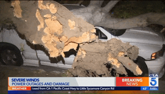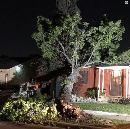 4月9日晚,洛杉矶迎来11级风暴,最高时速达70英里每小时。这场灾难性大风连夜卷整个南加州地区,导致众多社区的大树被连根拔起砸烂居民车辆,超过15个地区,超过4万居民家中断电。