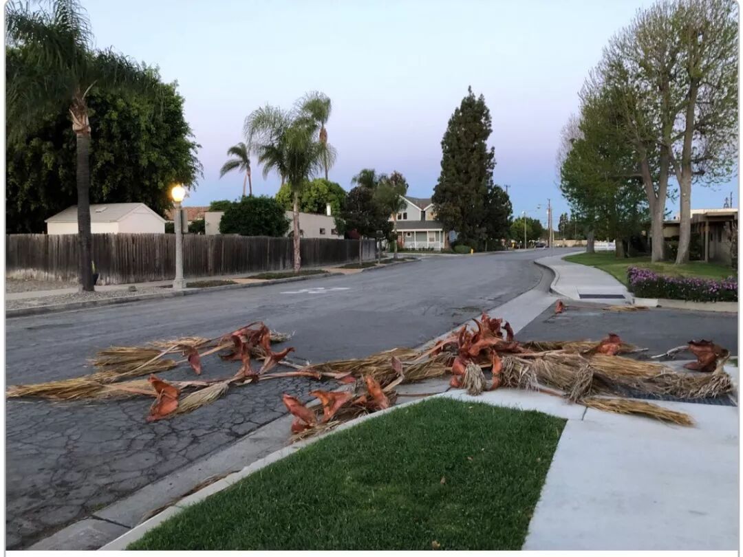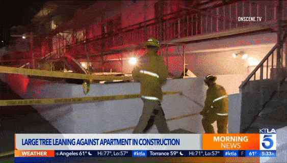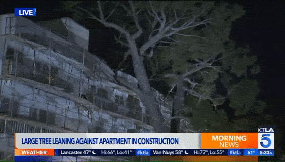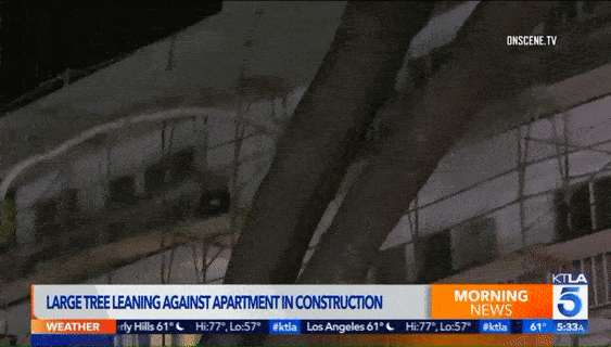 在西好莱坞(West Hollywood),大树被吹断后甚至砸向了街边的公寓,毁坏了公寓的顶部。