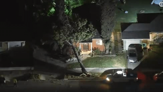 在Baldwin Park,暴风将一棵50英尺高的大树连根拔起,砸向路边一栋房屋。
