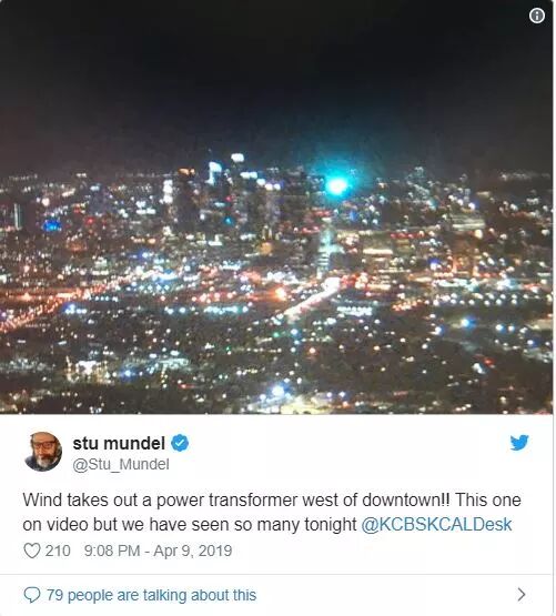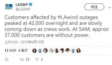 另一电力公司,南加州爱迪生公司(Southern California Edison)也发布Twitter表示,在他们服务的区域,有532起短路事故,造成16000户停电。截至周三凌晨4点,该公司用户中仍有近4000户无电可用。