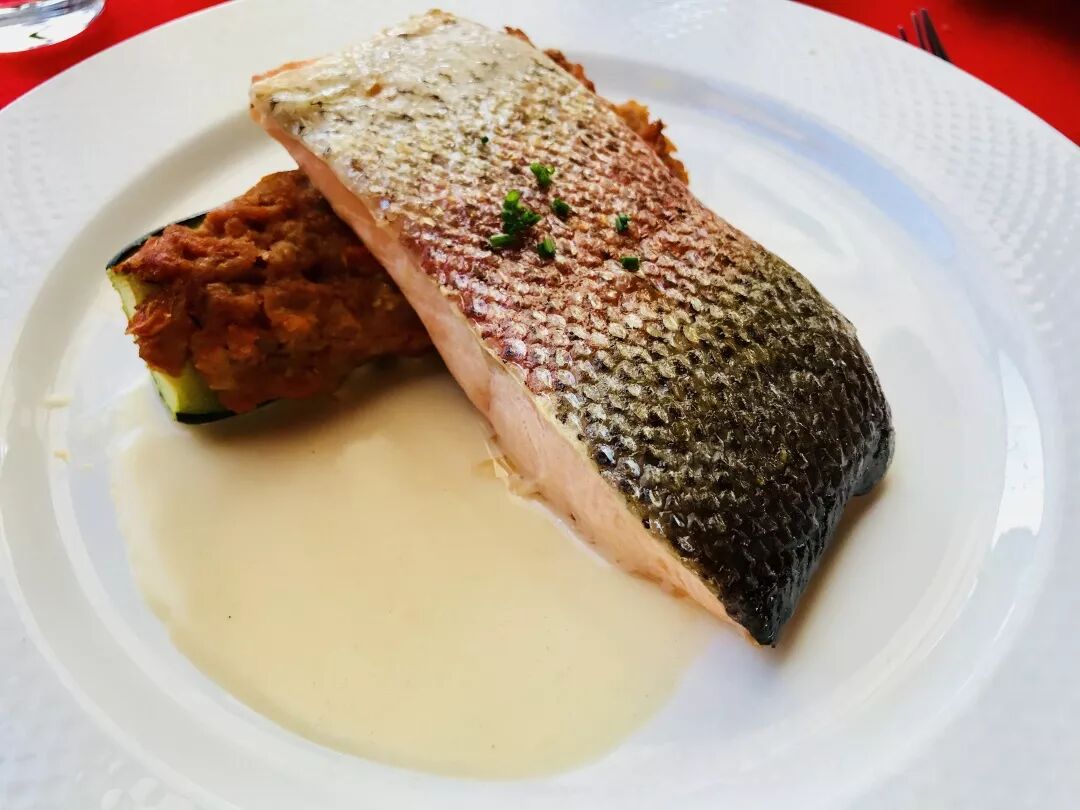 船上的晚餐比较简约,但不马虎,口味和盘式都还是保持了法餐的基本水准。主菜的烤鲈鱼和南瓜酱小鸭片,以及甜点百香果巧克力软蛋糕等依然可以吃出法餐的传统讲究。