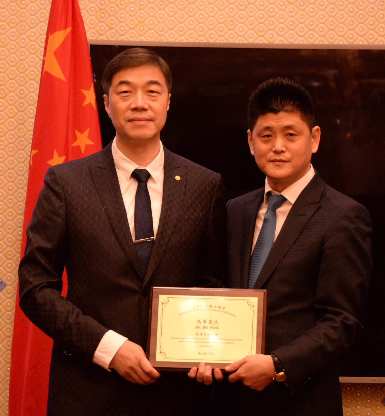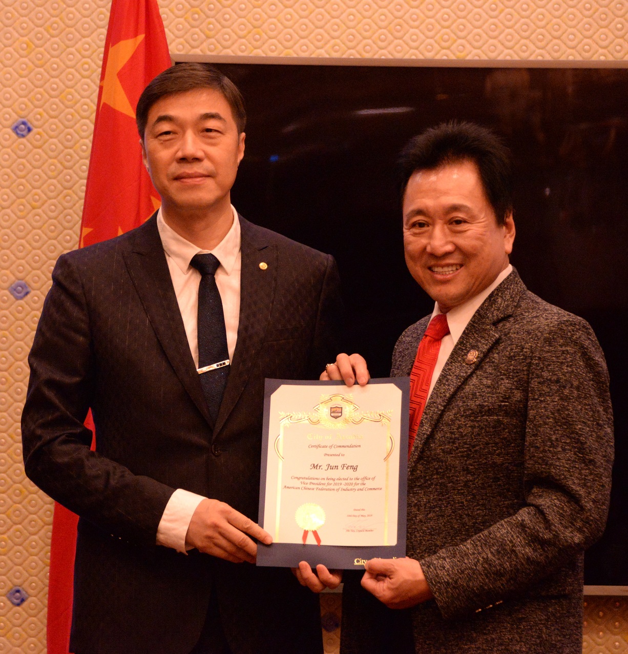 美中工商联合总会会长张勇向冯军颁发任职聘书