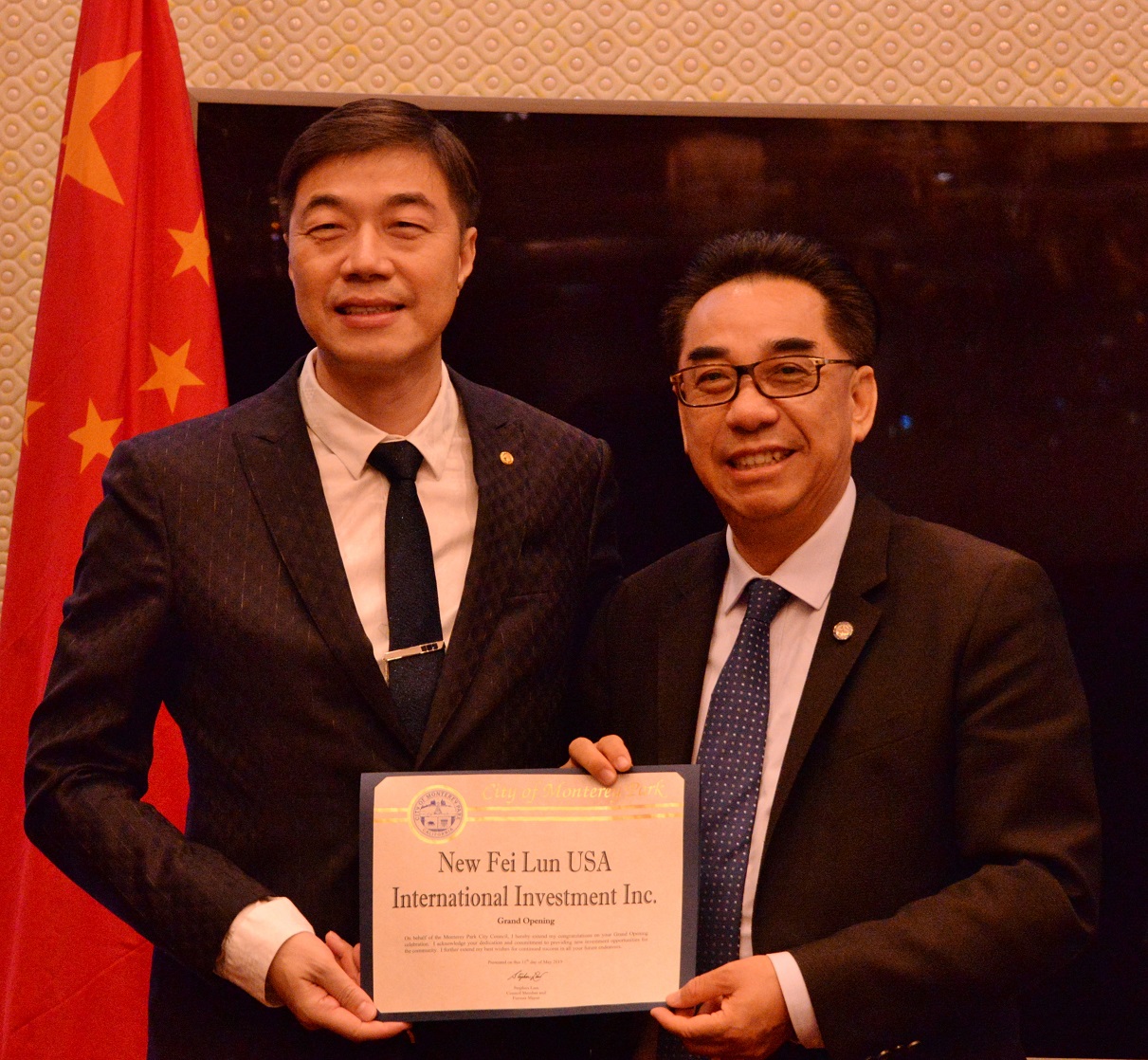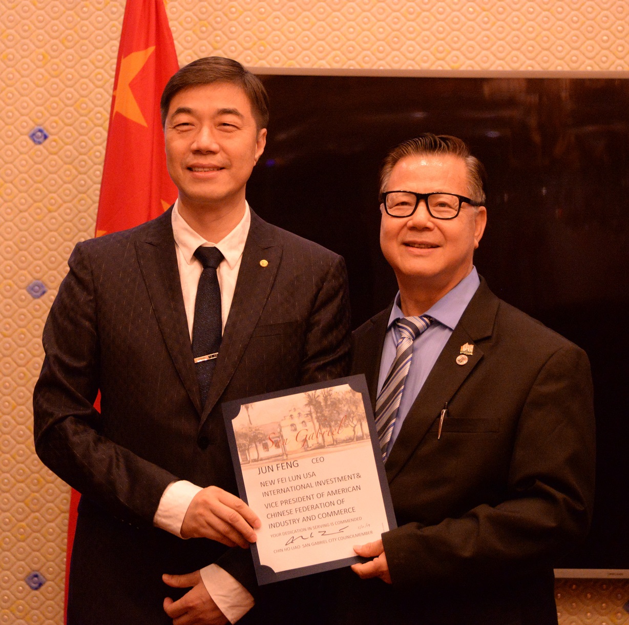 蒙特利公园市议员林达坚向冯军颁发贺状