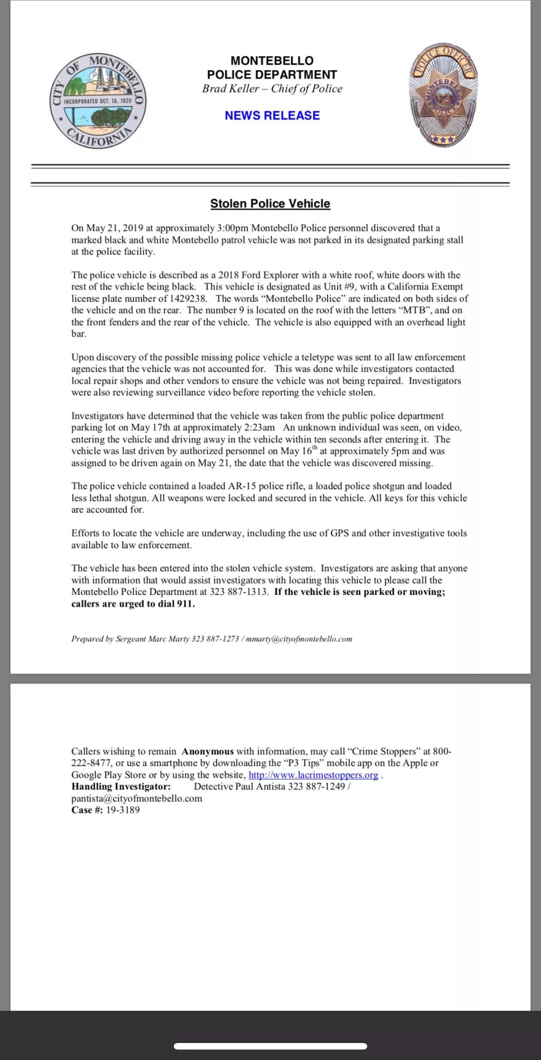 Montebello警局的官员Marc Marty表示,由于被盗警车内有一支警用AR-15步枪和2支散弹枪,虽然三部枪支全都被固定警车内,但使用一些特定装置可以取下这些枪支。警方最担心的就是偷窃者拿到警用步枪后,从事恐怖活动,威胁社区安全。