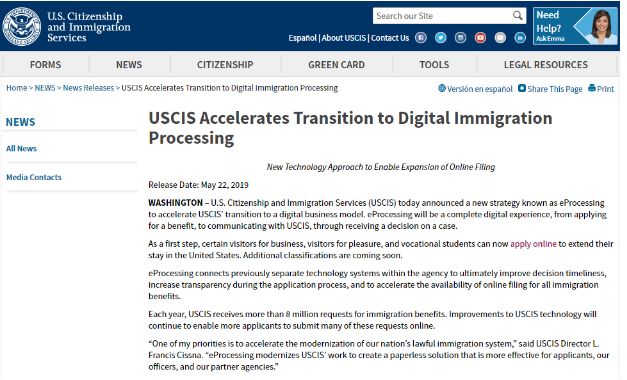 本周三,美国公民和移民服务局(USCIS)宣布了一项名为eProcessing的新战略,加快USCIS向数字化商业模式的转型。