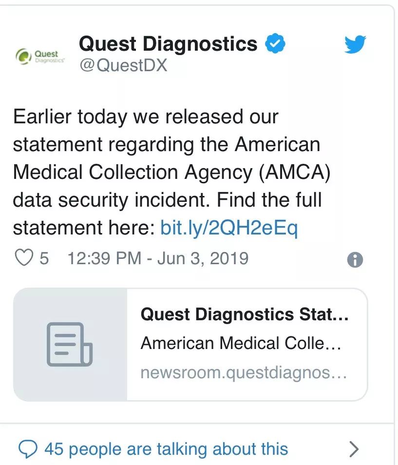 AMCA于5月14日在其支付页面上首次通知了Quest Diagnostic这起“潜在的未授权活动”,两周后,AMCA又向Quest和Optum360透露了更多关于这次入侵的信息,包括可能受到影响的患者人数以及被访问的信息。