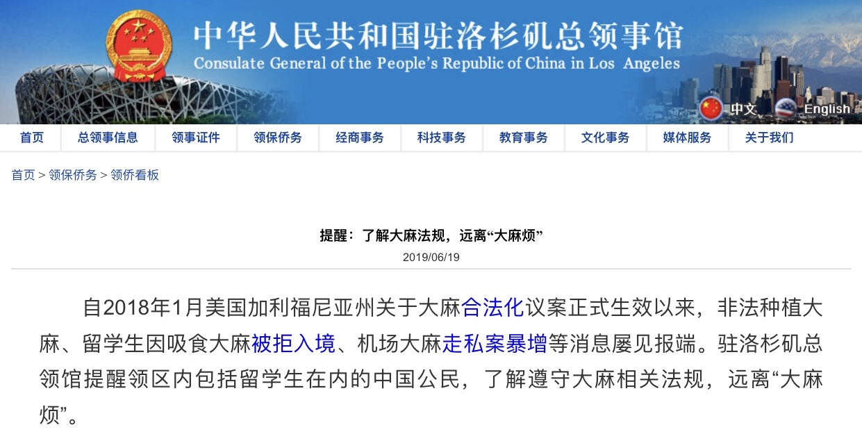 自2018年1月美国加利福尼亚州关于大麻合法化议案正式生效以来,非法种植大麻、留学生因吸食大麻被拒入境、机场大麻走私案暴增等消息屡见报端。驻洛杉矶总领馆提醒领区内包括留学生在内的中国公民,了解遵守大麻相关法规,远离“大麻烦”。