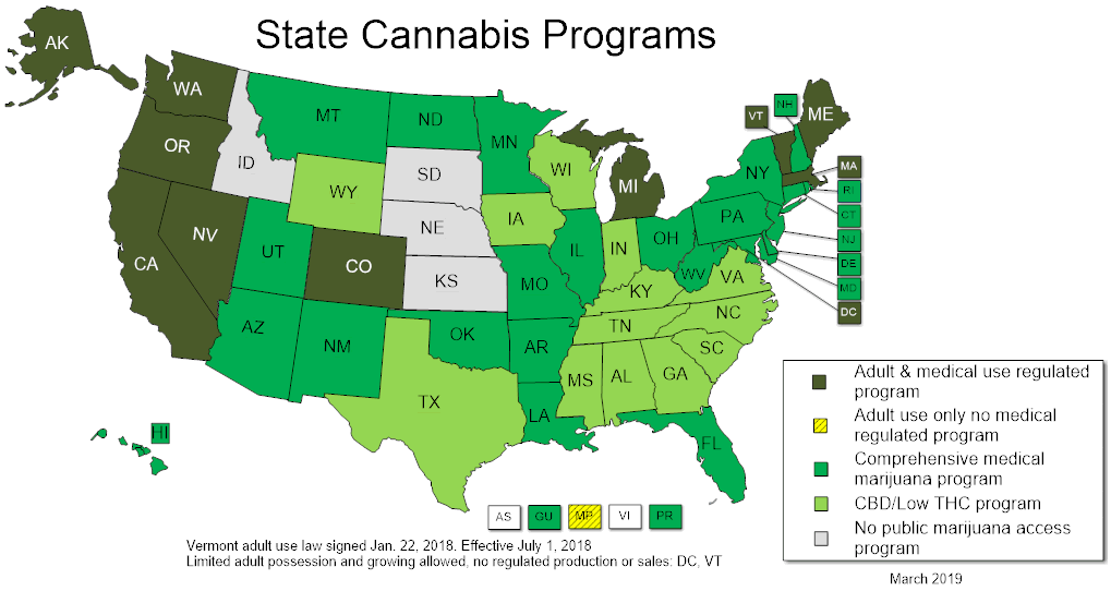 虽然大麻在部分州被合法化,但联邦《管制药品法》不承认医用大麻和消遣用大麻的区分,认为大麻没有医用价值,并将其与可卡因、海洛因一同列为一类管制毒品(Schedule I drug)进行管理。因此,即便在加州等已实现大麻合法化的州,购买、拥有、分发、吸食大麻也违反联邦法律,可能遭到美国移民管理机构等联邦执法机构的打击。在属于联邦的加州国家公园里吸食大麻也属违法。美联邦及各州法律均禁止跨州携带大麻,从公路、航班跨境携带大麻进入大麻合法的州也属违法,可能受到严格检查。