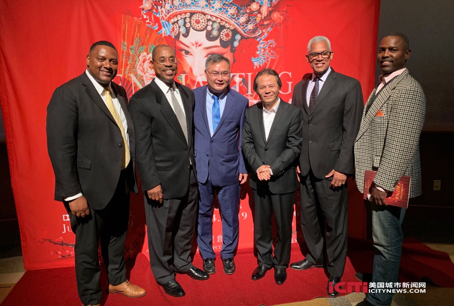 中国驻洛杉矶总领事馆总领事张平(左三)、中国广播民族乐团团长张高翔(右三)