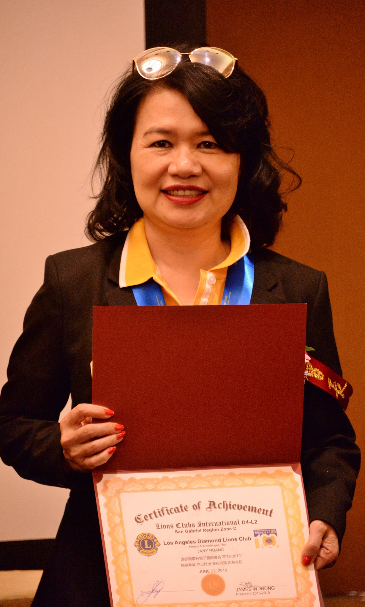 黄玲玲会长致词表示,“让爱飞扬,因为有你”,来年将带领新团队为社会提供更多服务,更多帮助残疾人士,及弱势团体。作为狮子会会长将旁无责贷,全心全力落实做好社区公益工作。洛杉矶钻石狮子会走过第10个年头,感谢狮子会创始人及全体狮兄姐们努力付出,为社区做出巨大贡献。多年来,狮子会无私付出,帮助脑性麻痹孩子、社区老人,涌现太多感人故事,令人感动,狮子会精神永放光芒,狮子会出钱,出心,出力,出席,发扬大爱精神,在学习中成长进步。
