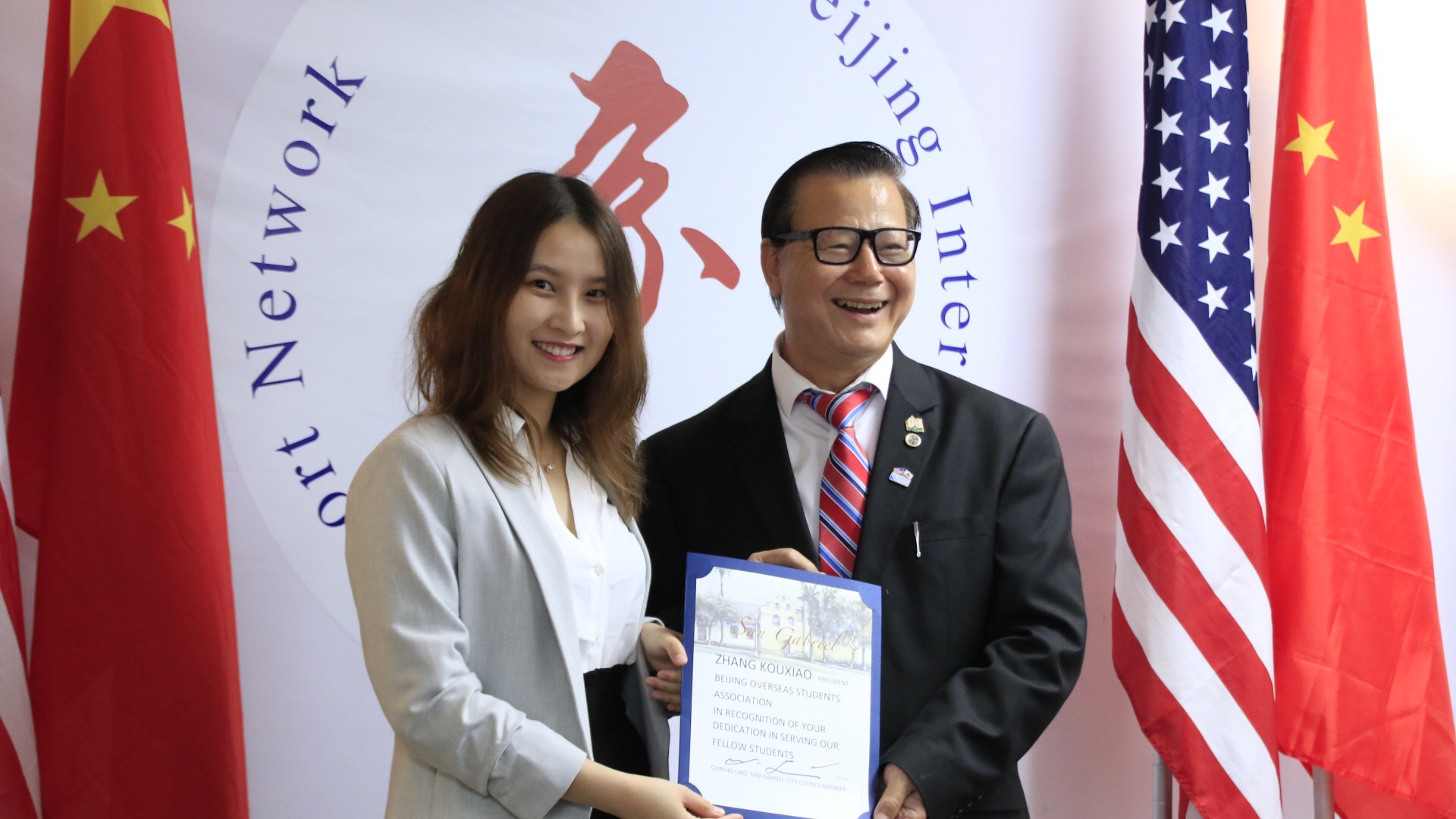 张口笑主席代表美国北京留学生协会向顾问委员会成员颁发聘书,并为北京留学生协会第一届执行委员会委员王彦艺、高鹏、李觉先、季嘉辰宣颁发执行委员委任证书。圣盖博市市议员廖钦和表示,热烈祝贺北京留学生协会成立,希望留学生能适应美国生活,创造性思考,希望留学生融入美国社会,大胆尝试。愿留学生在美国学习生活一切顺利,在美国的发展一帆风顺。