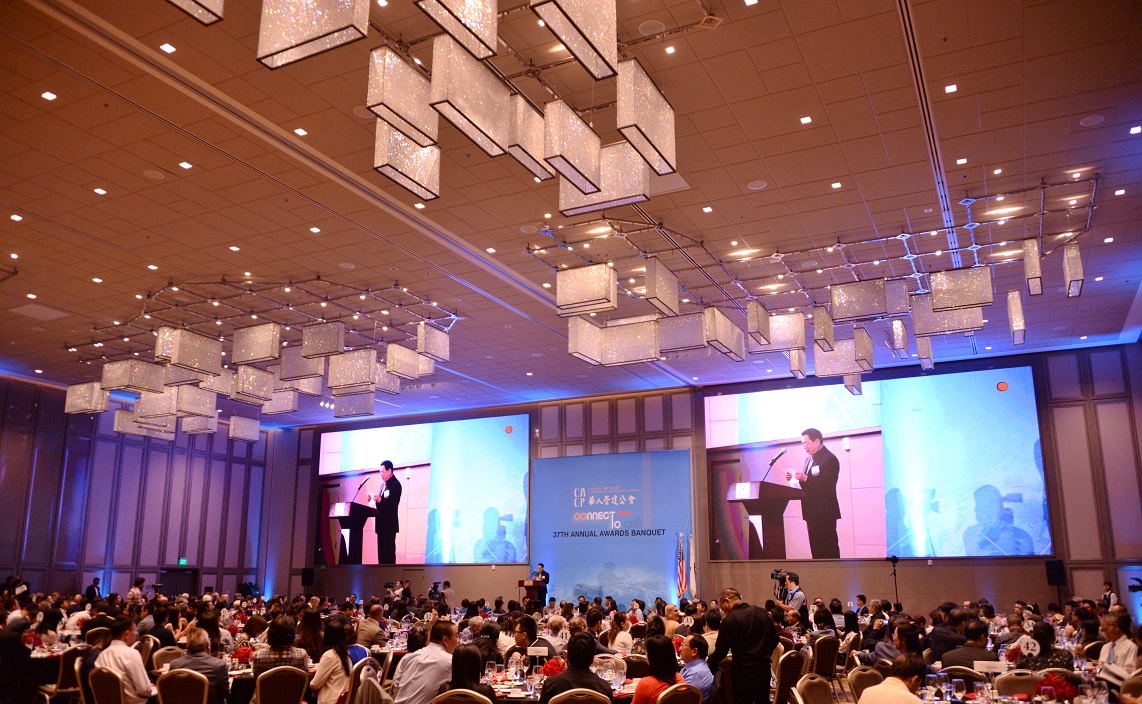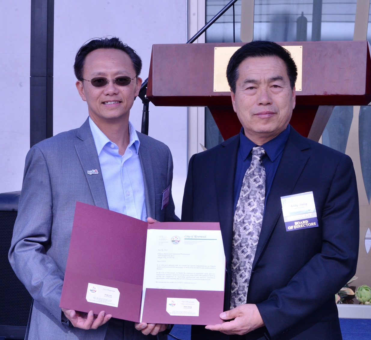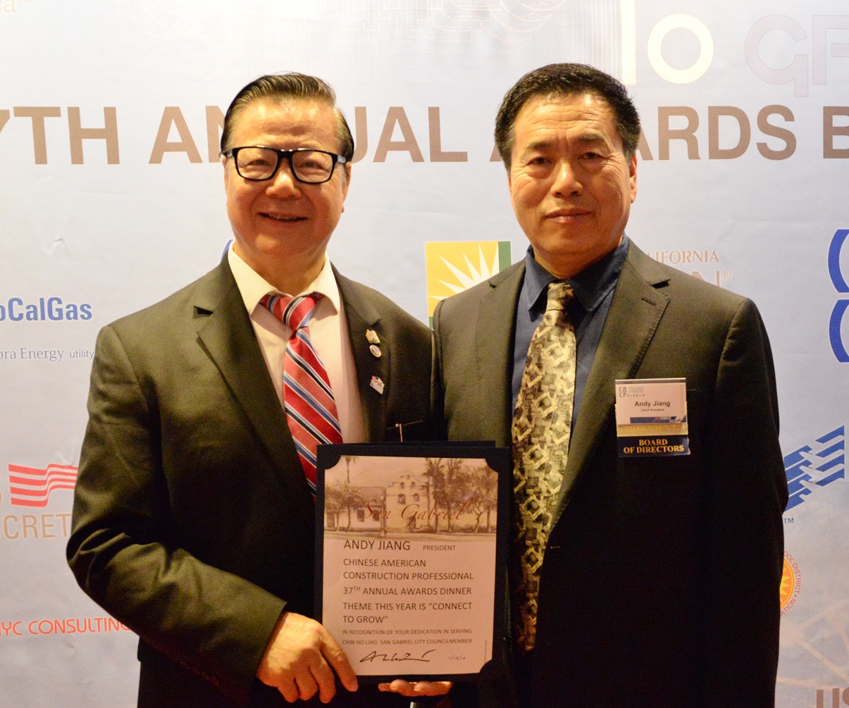 城市新闻7月19日圣盖博市报导,美国华人营建公会(CACP)在喜来登大酒店举行第37届年会暨颁奖晚会,姜晓东第3次担任会长,在加州众议员周本立的监誓下新一届理事会就职。年会表彰有突出成绩者,颁发奖学金。中国驻洛杉矶总领馆领侨处主任汤长安、侨务领事陈晓毅、加州众议员周本立、前加州众议员伍国庆、蒙特利公园市市长陈赞新、天普市市长文尙丞、圣盖博市市议员廖钦和、柔似密市市议员劳朱嘉仪、邓树灿、洛杉矶社区学院理事方树强、美国国会议员赵美心代表郑涵嫔、圣盖博商会会长郑博仁与社区各界人士近500人与会。年会由Miles Yu主持,年会主席Lynn Chen致欢迎词。