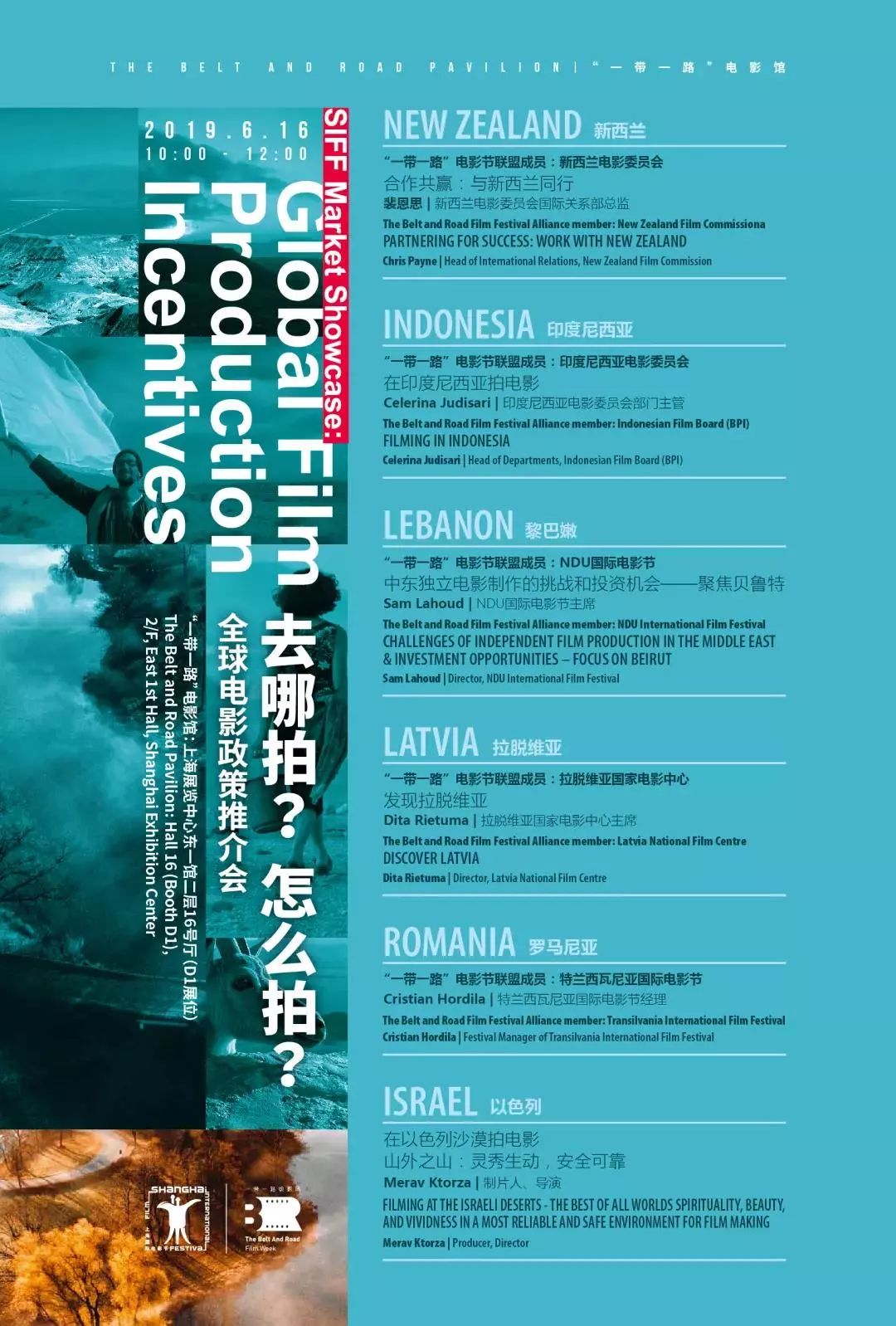 “去哪拍?怎么拍?- 全球电影政策推介会”将由来自新西兰、印度尼西亚、拉脱维亚、黎巴嫩、罗马尼亚、以色列六国的电影机构将在6月16日上午10点到12点向市场来宾介绍其本国的合拍片政策、拍摄基地和拍摄优惠政策。