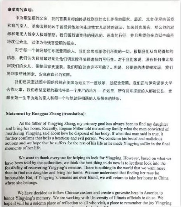 但是章莹颖家人的善良,着实让现场每一个人感动。在女儿经历如此巨大的灾难后,章莹颖家人仍在本周委托律师和伊利诺伊大学香槟校区校方,成立章莹颖基金,基金将为在校就读的国际学生及其家人在遭遇紧急情况,且缺乏资金时,提供资金援助。目前,基金已经收到超过33000美元的资金捐助。