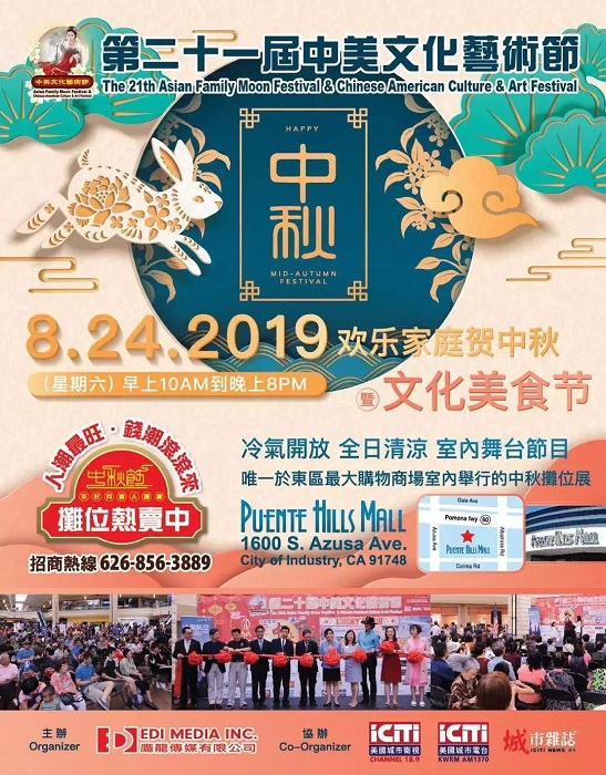 以“月圆人圆两团圆”为文化背景、美国鹰龙传媒主办、洛城东区最大的第二十一届欢乐家庭贺中秋继中美文化艺术节即将于8月24日在罗兰岗Puente Hills Mall举行。感谢主要赞助商华美银行及以下赞助商的特别支持!