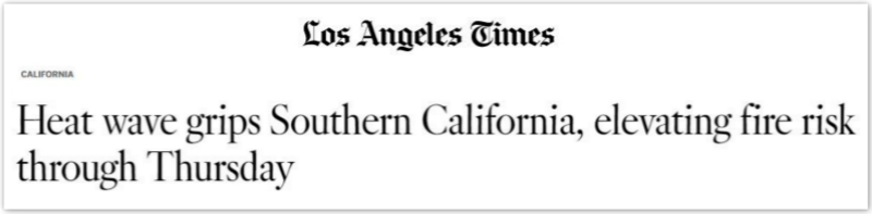 据《洛杉矶时报》报道,加州气象部门发布的最新气象结果显示,南加州部分地区的热浪预计将持续到周四,这将增加加州发生丛林火灾的风险。