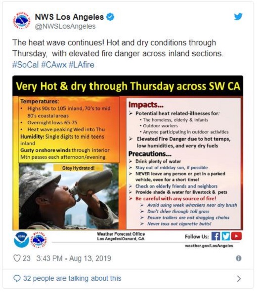 南加州的内陆温度预计将达到95到105度,湿度非常低。另一方面,根据美国国家气象局(National Weather Service)的数据,沿海地区的气温将明显下降,最高气温将在70年代达到顶峰。国家气象局官网发布的推特表示:“热浪还在继续!周四天气炎热干燥,内陆地区火灾危险加剧。”