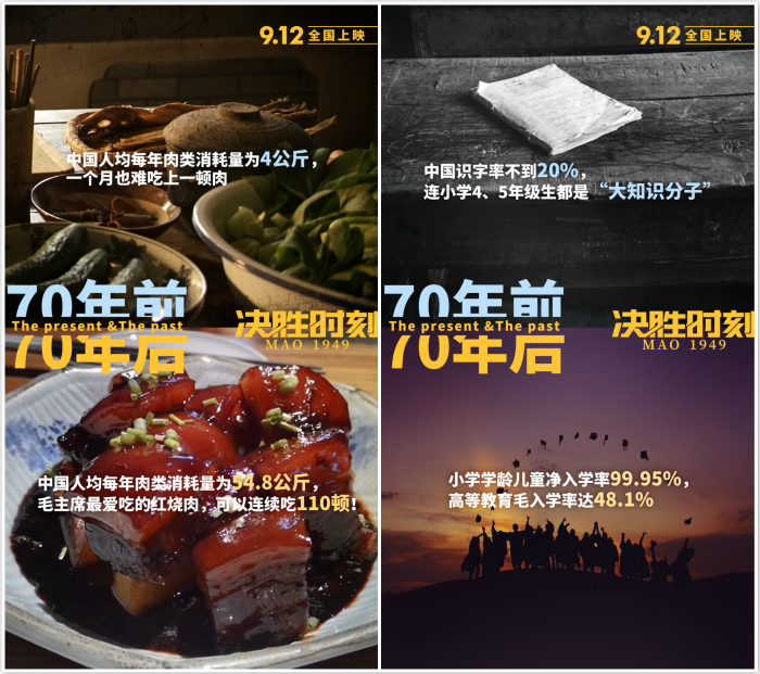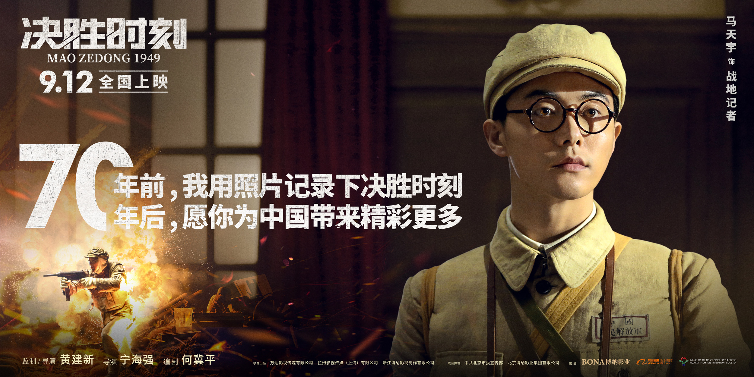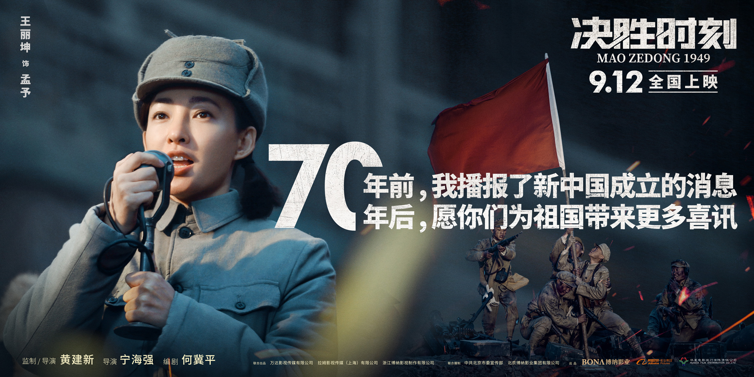 由博纳影业集团股份有限公司、阿里巴巴影业(北京)有限公司、华夏电影发行有限责任公司出品,万达影视传媒有限公司联合出品,黄建新监制导演,宁海强共同导演,唐国强、刘劲、黄景瑜、王丽坤、张涵予、濮存昕、刘之冰、马晓伟、曹炳琨、秦岚、林永健、聂远、杜江、马天宇、吴昊宸、叶禾、高曙光、高戈等主演的电影《决胜时刻》的“70年记忆”海报带人们回到70年前,海报中六个见证新中国成立荣耀历史的角色,代表了70年前千千万万为民族解放、国家富强贡献宝贵力量的坚定身影,用一句句温情的话语,寄托了置身于那个时代的人们对祖国未来的美好祝愿。