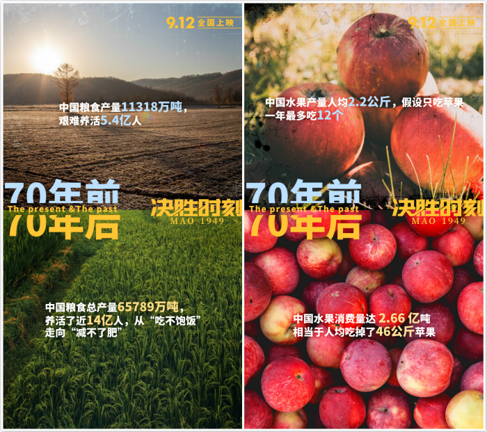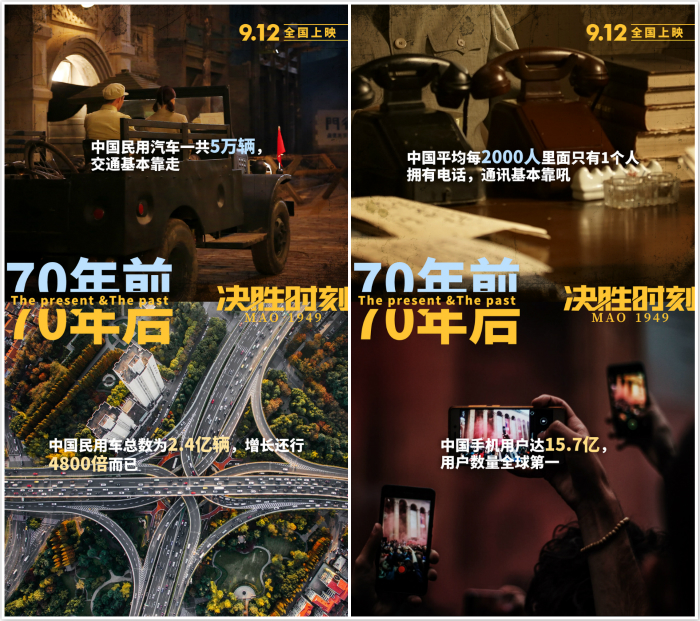 海报内容以角色口吻讲述“70年前”各自的责任担当,倾述了对新中国的无限畅想。每一声温润人心的独白,都饱含那些为新中国的诞生努力付出的人们对未来的祖国和人民深深的祝福。唐国强饰演的毛泽东,向今天的人们发出“团结一心共建未来”的期盼,是一代领袖对后人凝聚力量建设祖国的殷切嘱托;黄景瑜扮演的警卫员陈有富,则用一句“请接力奋进守护这锦绣山河”,表达了传承保家卫国使命的热烈希冀。