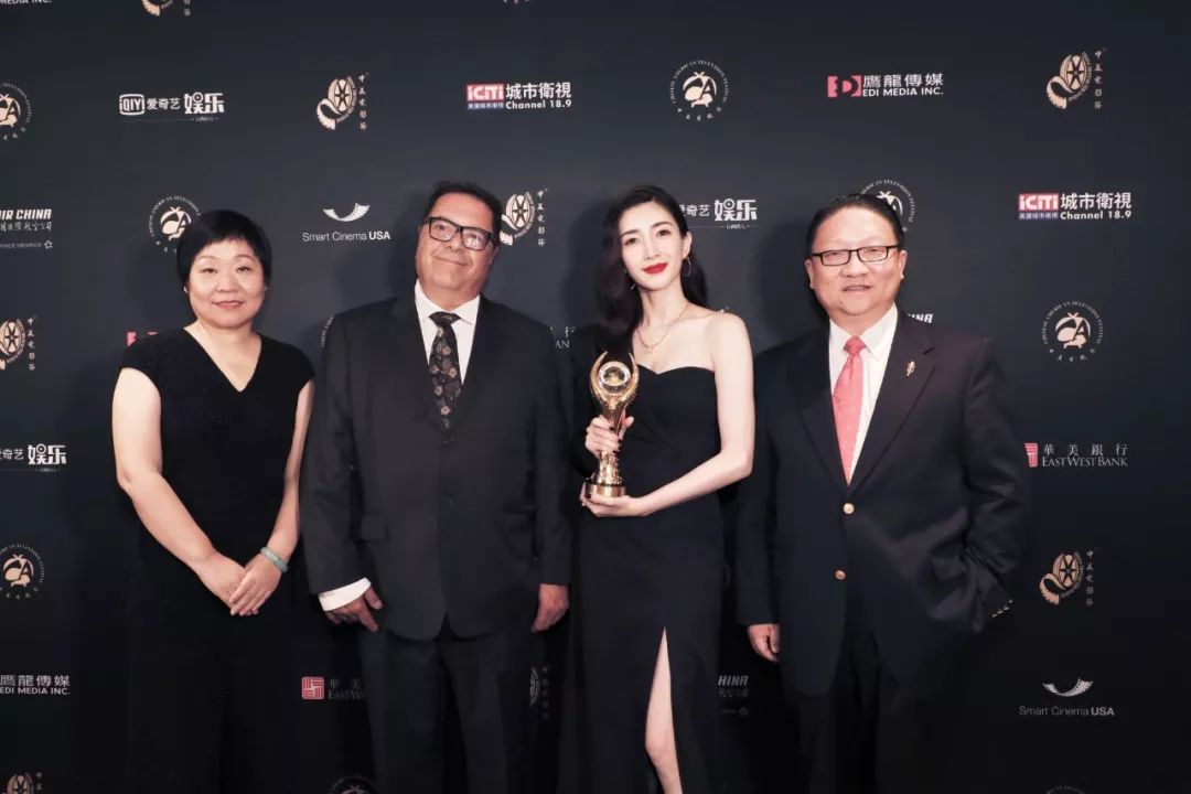 左起:华纳兄弟中国区总裁赵芳、3alitytechnica公司总裁Steve Schklair、2019年中美电视节年度最佳女主角江疏影、中美电影节|中美电视节主席、美国鹰龙传媒董事长苏彦韬