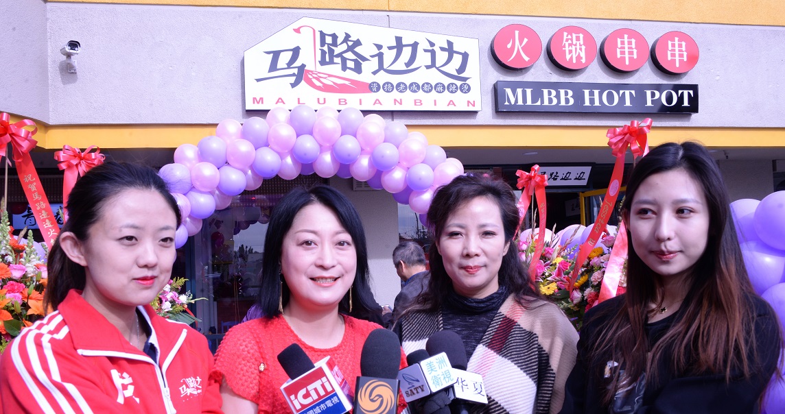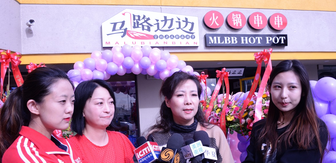 马路边边火锅串串负责人刘莉(右2)接受记者访问