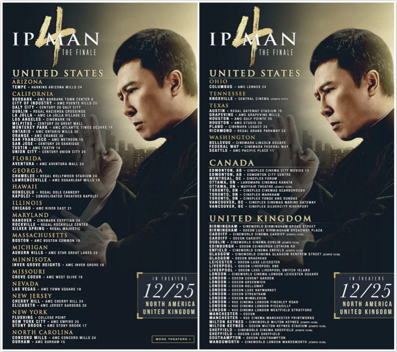 功夫钜制《叶问4》延续前三集的功夫动作金牌老班底,由叶伟信指导,黄百鸣监制、黄子桓编剧、袁和平动作指导;甄子丹、熊黛林、吴建豪、吴樾、斯科特阿金斯领衔主演,郑则仕、陈国坤、高战、吴千语联合出演。电影由北美华语电影发行商WELL GO USA 独家发行,美国、英国及加拿大娱乐文化主流市场,包括院线上映和线上线下的宣传及发行。
