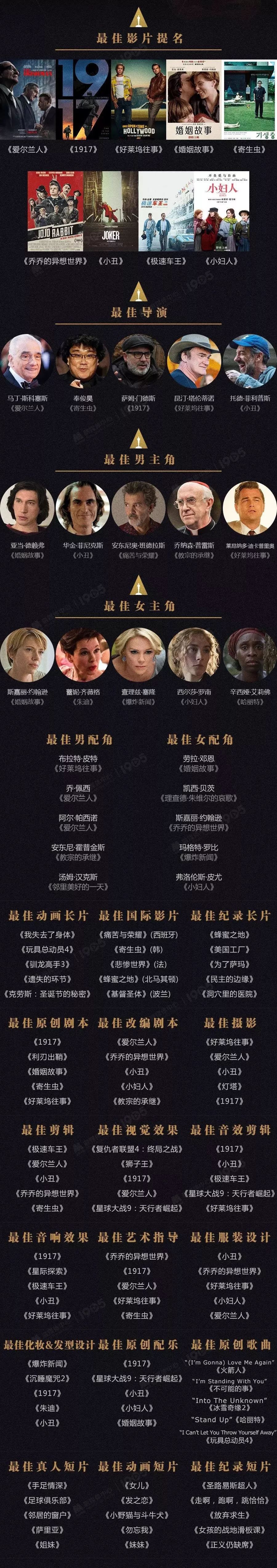 获最佳影片提名的还有:赛车电影《赛道狂人(Ford v. Ferrari)》、讽刺喜剧片《乔乔的异想世界(Jojo Rabbit)》、经典名着《小妇人(Little Women)》、家庭剧情片《婚姻故事(Marriage Story)》跟韩国电影《寄生虫(Parasite)》。