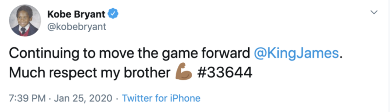 就在事故发生前一天的比赛中,湖人球星勒布朗·詹姆斯(LeBron James)刚刚打破了科比的得分纪录。虽然那场比赛科比没有出现在比赛现场,但他在推特上恭喜了詹姆斯:“让比赛继续前进@KingJames。尊重我的兄弟。”