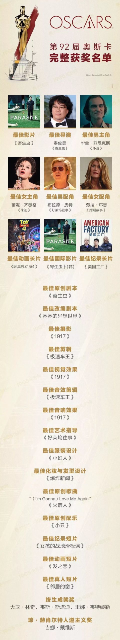 以下是第92届奥斯卡金像奖完整获奖名单: