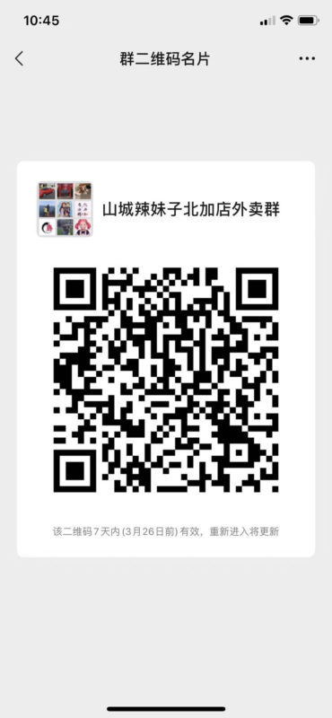 山城辣妹子外卖服务,只要扫描二维码付款、立马配餐、自取送餐两相宜,点餐$50起送餐,5里之内送餐免费、5里以上送餐收取$1/里。点餐$80起免费赠送调料、小吃,到店取餐, 15%Off优惠,一通电话,送餐到车旁。