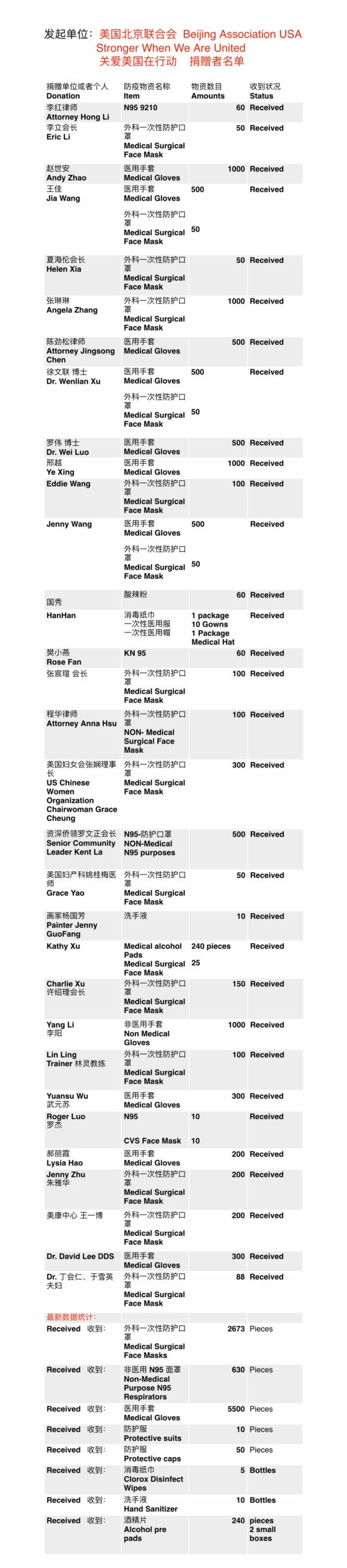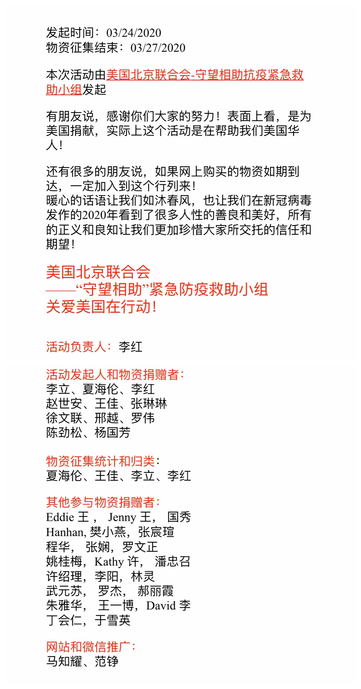 这个活动也得到了资深侨领罗文正会长的支持,他寻渠道买到500个非医用N95 防护面罩,由司机开车亲自参加捐献,积极响应美国北京联合会发出的这个关爱美国的行动。 北京会执委张琳琳,辗转买到 1000个一次性的手术口罩直接寄来。还有美国华人妇女联合会的理事长张娴托人送来了300只一次性外科手术口罩。有朋友说,自己家里都没有物资,但表示愿意捐钱! 由于,前不久都捐过钱了,不能给大家带来大多的压力,量力而为,心意到了就好。