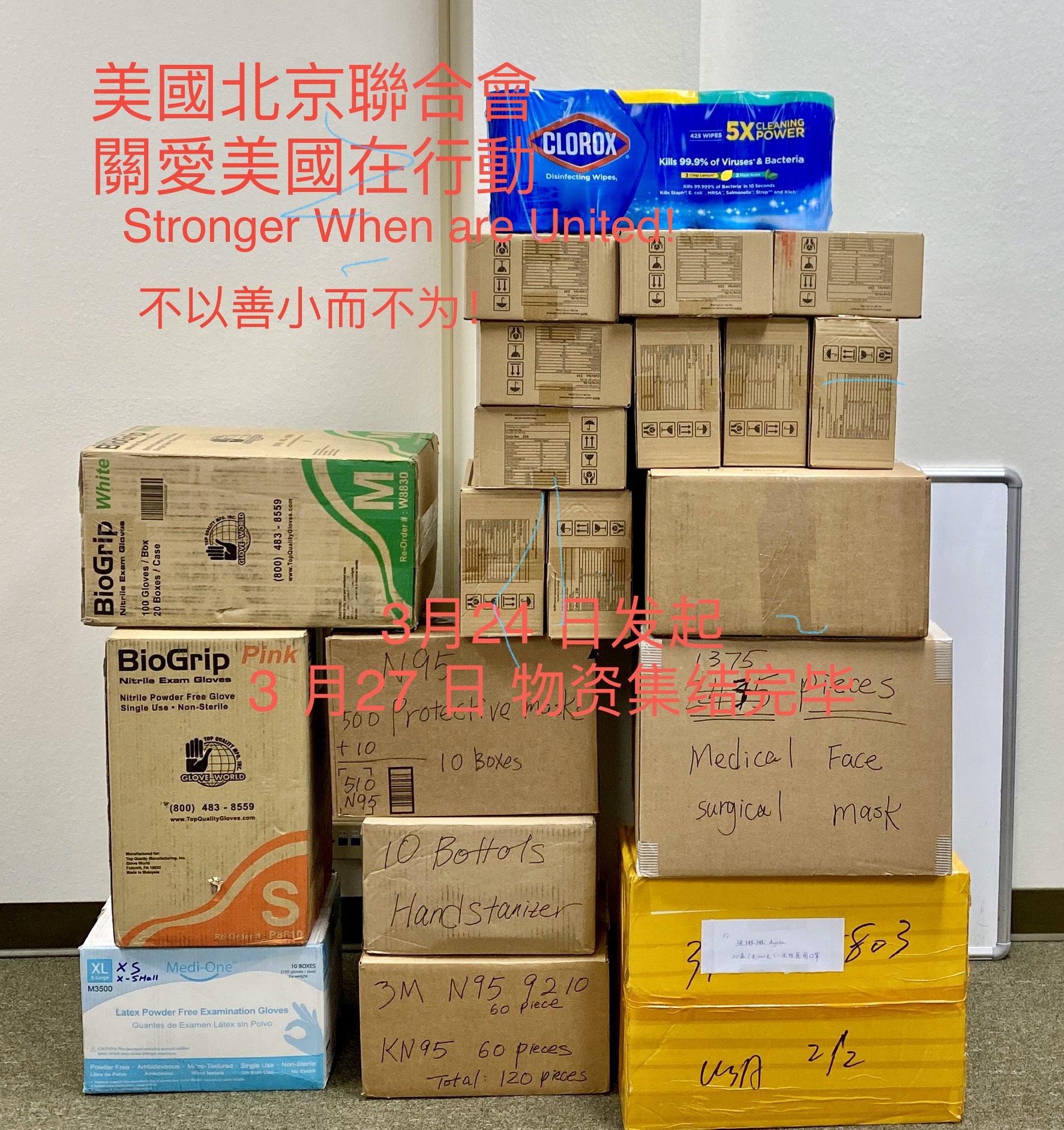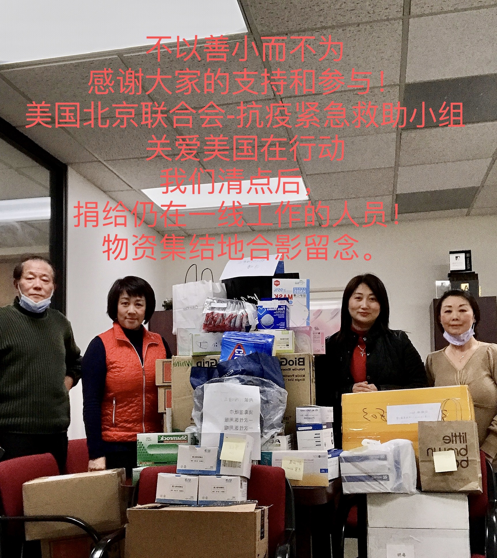“不以善小而不为” !新冠肺炎疫情在美国本土3月12日之后愈发严峻,南加州美国北京联合会的几位义工干部们赵世安、张琳琳、徐文联、邢越率先在群里呼吁和响应,我们曾为祖(籍)国抗击疫情捐款捐物,现在是时候给我们的第二故乡美国献出我们应有的关爱和回馈了!于是由李立、夏海伦、李红发起,短短半小时10位成员成立了“守望互助-防疫紧急救助小组”, 带头先把自己家里储备的口罩、手套等捐献出来。紧接着又分别发布在美国北京联合会的会员群、朋友群等若干群,从3月24日到3月27日,短短3天,美国北京联合会收到会员、南加州侨团领袖以及会员之友的响应,总共收到一次性防护口罩2673个,非医用N95防护面罩630个, 一次性医用手套5500只,10瓶洗手液,以及消毒纸巾等物资,初步保守估计总价值在5000美金左右。