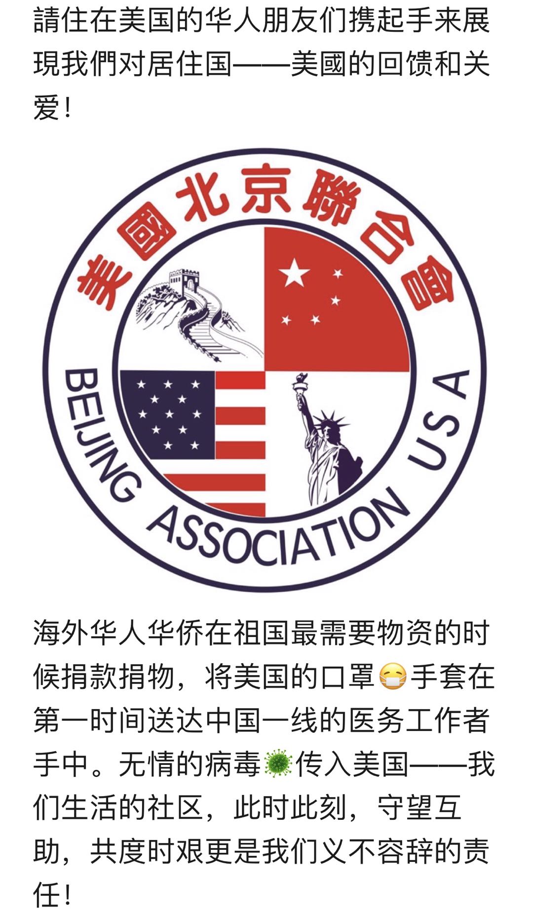 美国北京联合会常务理事长李红律师说, 可能和许多海外华商大手笔捐赠口罩等物资相比,我们的捐献数量显得微小,为社区所做的不够多,但是“不以善小而不为”这句话鼓励着我们,省出家里自用的捐献出来,这本身就是出于真爱,也代表了普罗美国民众的真实生活现状。 有的会员朋友自己都没有买到口罩,但是,他们很乐观地说,把口罩留给更需要的人吧,我们可以“宅在家里”不出去。