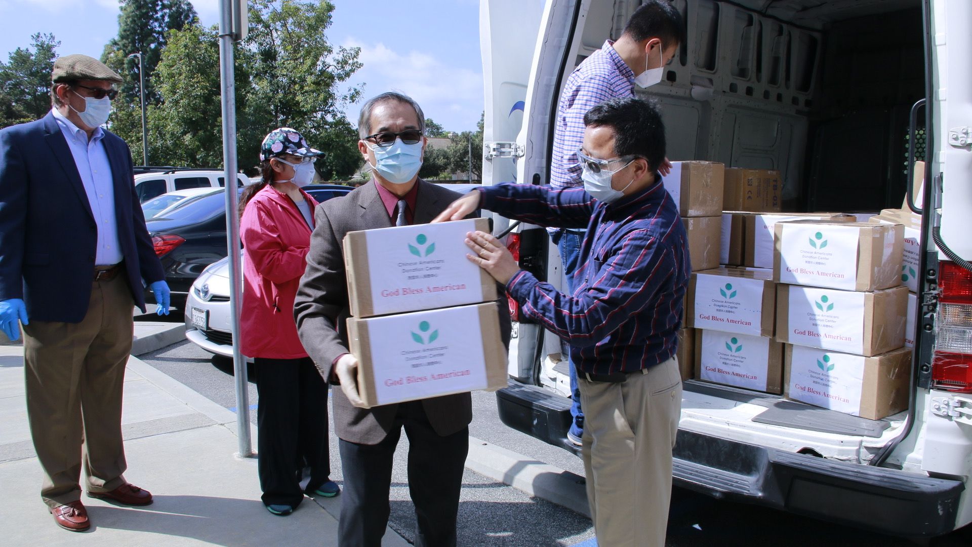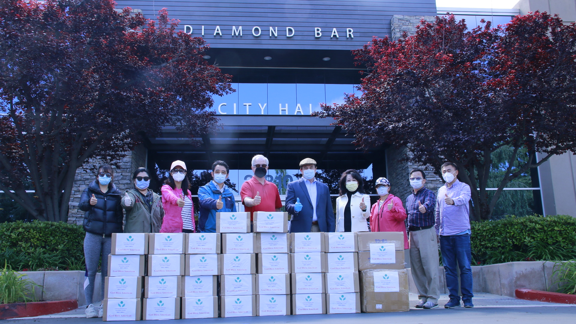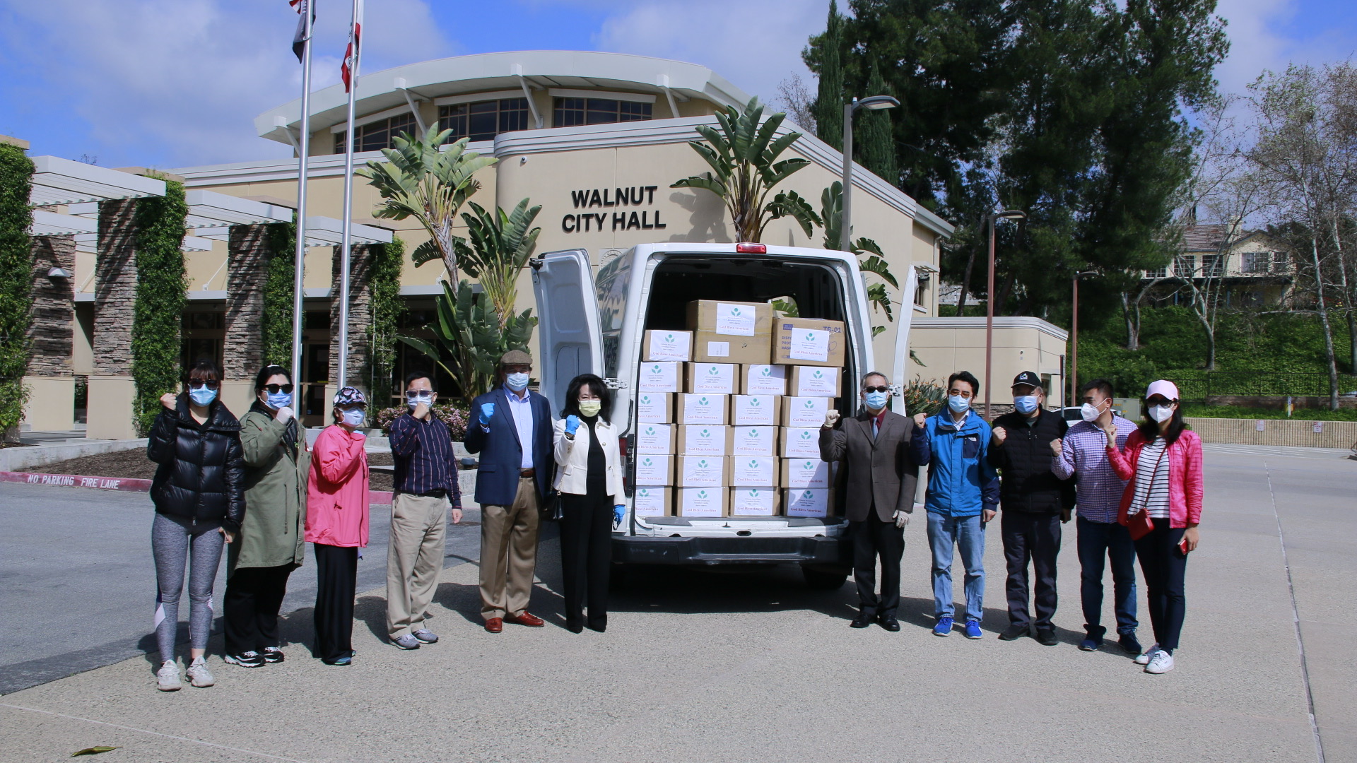 4月21日,美国华人捐赠中心的义工们来到核桃市和钻石吧市,向两个城市市府捐赠口罩和手套等物资,帮助市府抗击疫情。钻石吧市市长Steve Tye、核桃市市议员伍立伦分别接受物资。前加州参议员夏乐伯及夫人何美湄、美中交流协会基金会主席林旭、义工Herry li等参加捐赠活动。