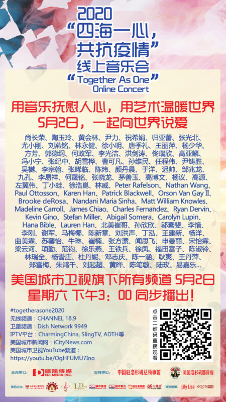 经过短短不到两周时间的紧张筹备,“四海一心 共抗疫情”(Together As One)线上公益音乐会即将于美国西岸时间5月2日(今日)下午3点iCiTi TV美国城市卫视旗下所有平台全球直播。在疫情期间,这场凝聚了上百位中美音乐家和艺术家,荟萃东西方艺术与文化的暖心音乐会将有哪些精彩节目和明星嘉宾亮相呢?在音乐会直播正式开启前,让我们带您先一饱“眼”福!